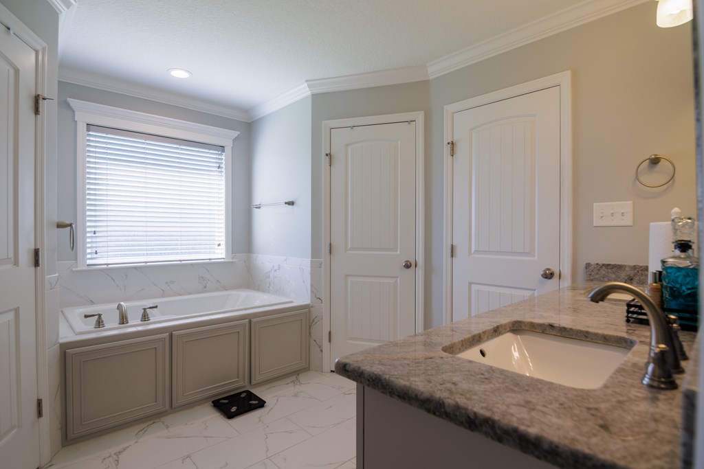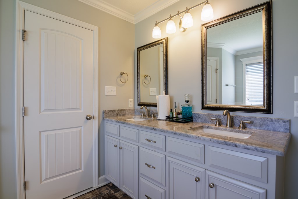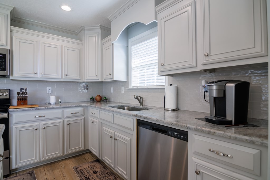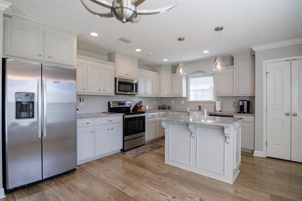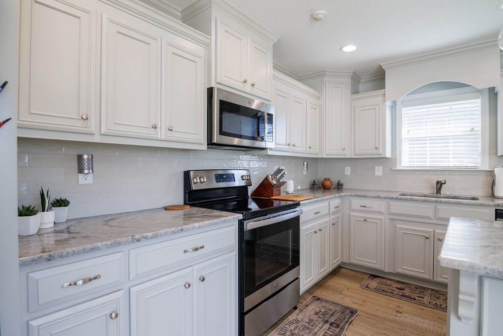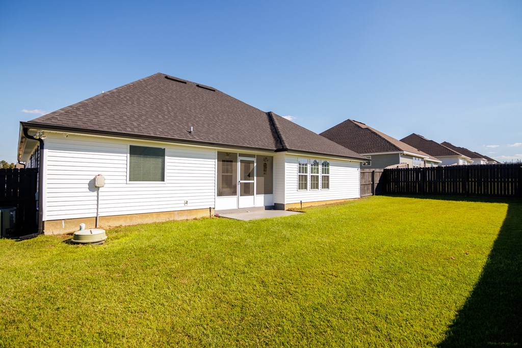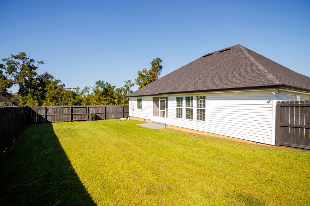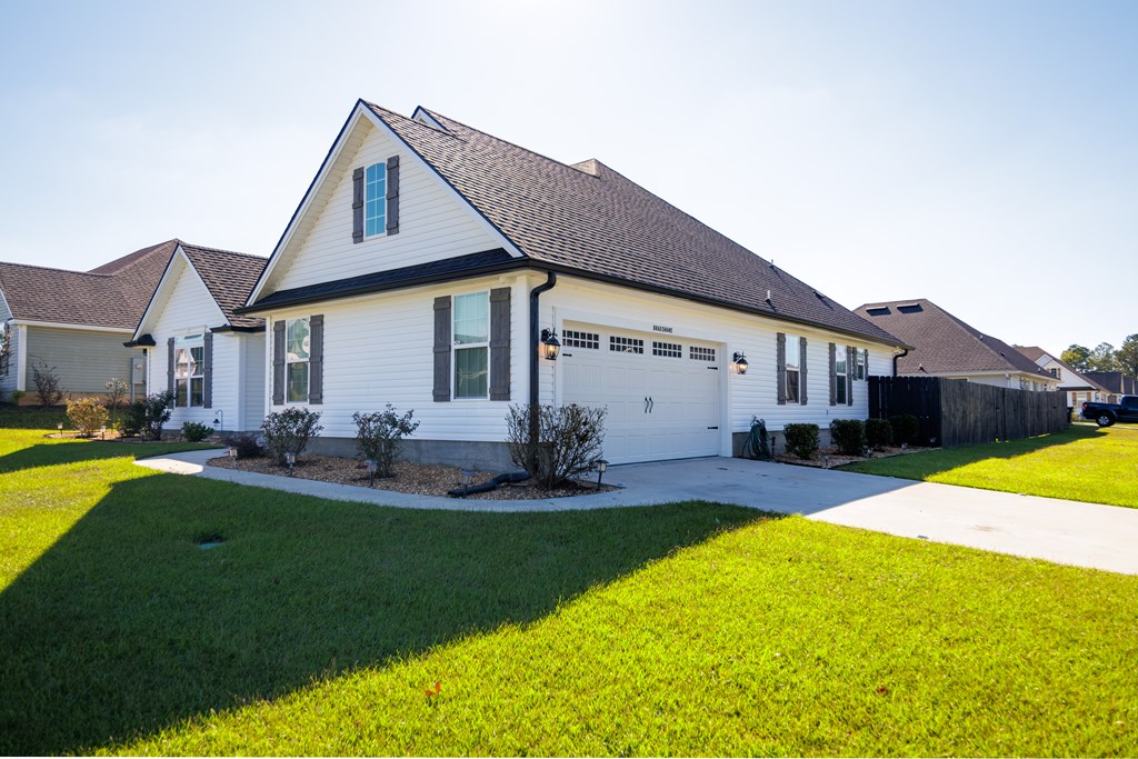 Four-bedroom, two-bath home in The Landing subdivision situated on a corner lot in Valdosta, Georgia. The kitchen features custom cabinets, granite countertops, under cabinet lighting, a tile backsplash, and stainless steel appliances including the refrigerator. The primary suite offers double vanities, his and her closets, a tiled shower, and a jetted soaking tub. Blinds are installed throughout with a plantation shutter on the front door. Luxury vinyl plank flooring runs through the main living areas, with carpet in the bedrooms and tile in the bathrooms. This beautiful HAHIRA home qualifies for 100 percent USDA financing for eligible buyers and is located in one of the area's most desirable neighborhoods. Measurements were taken by CubiCasa floor plan scan.